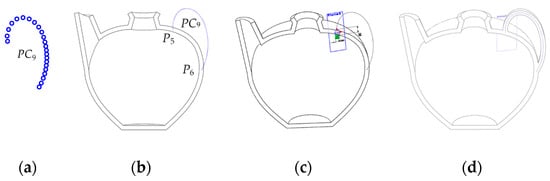 In the third step, the point cloud PC9, shown in Figure 19a, is injected on the solid CAD model, as shown in Figure 19b. In this case, PC9 must iterate so the start point P5, and endpoint P6, must lie on the mid-section of the outer and inner surface of the body, shown in Figure 19b. Taking P5 and PC9 as a reference, plane 3 is created and then the ellipse is constructed on plane 3, as shown in Figure 19c. Then, applying the sweep function on the ellipse and taking PC9 as a sweep path, a handle is created. The resulting solid CAD model is shown in Figure 19d.