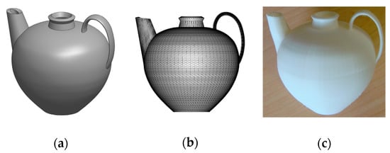 Ewer model. (a) Rendered solid CAD model; (b) triangulation model; (c) 3D printed model.