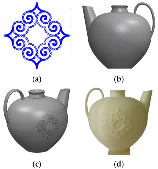 Figure 21a shows the point cloud of the texture. This point cloud is injected into the solid CAD model of the ewer, as shown in Figure 21b. Then, the texture on the front side is constructed by extruding the point cloud from the surface of the ewer. The texture on the backside is constructed by mirroring the front side texture. The result is shown in Figure 21c. Finally, the physical model is realized using a 3D printer, as shown in Figure 21d.