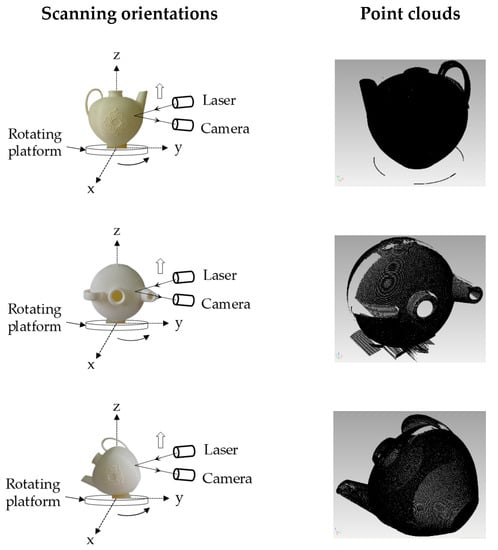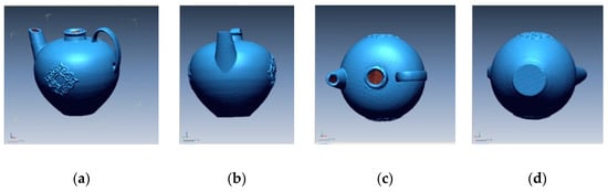 In addition to texturing, the 3D printed physical model of ewer shown in Figure 21 is scanned using a 3D scanner available at the Kitami Institute of Technology. Three different orientations are implemented to scan the ewer, as shown in Figure 22. Point clouds are then preprocessed (removing noise points, removing redundant points, and combining all point clouds into a single coordinate) and a triangulation model is created directly from the point cloud. The triangulation model is shown in Figure 22. Afterwards, a solid CAD model is constructed from the triangulation model. As seen in Figure 23a, the texture is a blur and there is also surface distortion near the handle. To make the texture sharp, clear, and have a smooth surface, it requires the user efforts while performing solid CAD modeling. It is worth mentioning that the triangulation model from the 3D scanned point cloud (Figure 23) consists of 271,803 facets and 815,409 vertices, whereas the triangulation model from the PCA-based point cloud has 25,336 facets and 76,008 vertices for the model without texture (Figure 20b); and 51,244 facets and 153,732 vertices for the model with texture (Figure 21d). It is clear that the 3D scanned point cloud has 10 times higher facets than the PCA-based point cloud. As a result, the 3D scan-based approach becomes user-dependent and requires heavy computation. Table 2 shows a summary of the number of points, facets, vertices, and printing time required to manufacture the physical model of the given ewer.