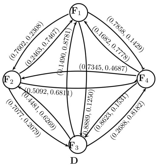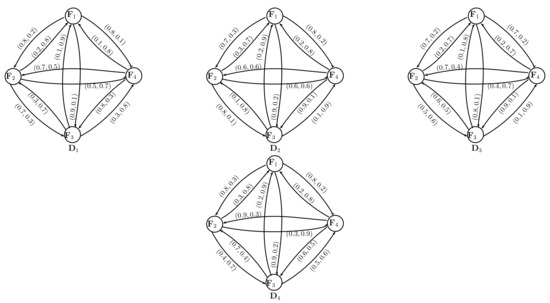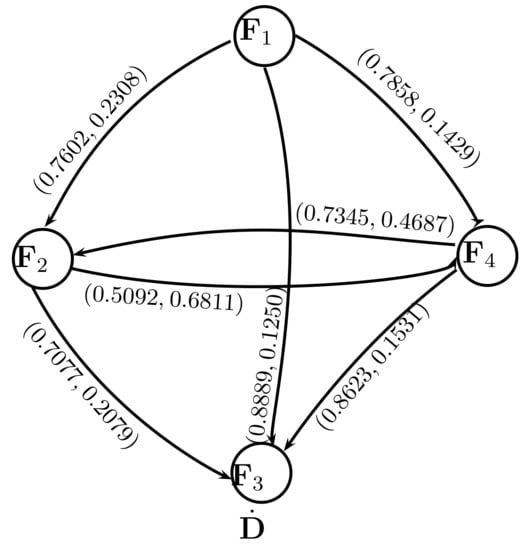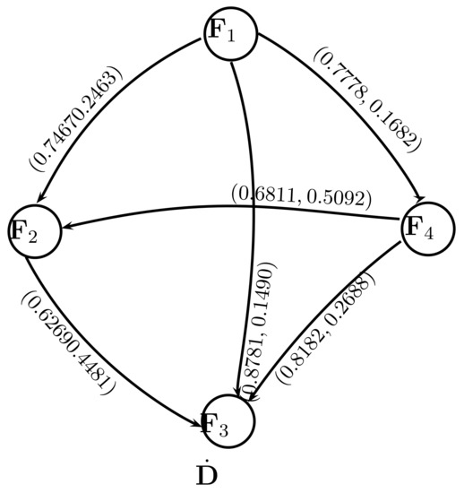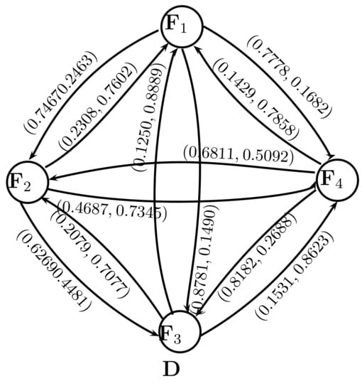 The Pythagorean fuzzy directed network (PFDN) concerning PFPRs provided in Table 1, Table 2, Table 3 and Table 4 is displayed in Figure 13.