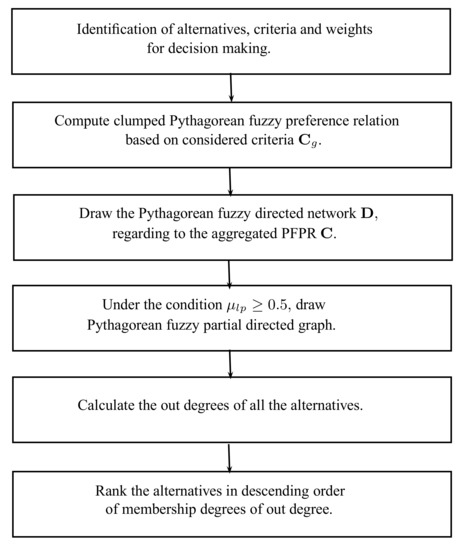 Graphs connect objects, but if in the connection there exists vagueness, then it can be considered as a fuzzy graph (FG). Rosenfeld [10] presented the structure of FG by establishing the fuzzy relation on FS with minimum and maximum operators. Further, several operations on FGs were discussed by Mordeson and Peng [11]. As the hesitant part was not clearly expressed, therefore Atanassov [12] generalized FSs to intuitionistic fuzzy sets (IFSs) by appointing membership and non-membership grade to the units, fulfilling the requirement with hesitant part . Due to the wide range of graph theory applications, Shannon and Atanassov [13] gave the proposal of IFGsby taking into account intuitionistic fuzzy relations on IFSs. To deal with impreciseness and complex uncertainty, Yager [14,15,16] developed Pythagorean fuzzy sets (PFSs) with the requirement , where and depict non-membership and membership grade, respectively. After that, the dual aspects of a unit were explained by Zhang and Xu [17] with the Pythagorean fuzzy number (PFN). In any decision-making atmosphere, the encouragement of PFSs can be seen; a professional provides the preferable information with membership and non-membership , and one may observe that the IF number fails to tackle this state, as . Besides, Hence, a greater amount of haziness can be dealt with by the help of PFSs. The concept of PFS has been prosperously applied in numerous fields [17,18]. In practical MCGDM situations, Akram et al. [19,20] proved that PFSs are much more reliable in handling haziness. Under the PF environment, some operations [21] and the TODIM technique for MCDM problem [22] have been studied. Moreover, it has been examined from several perspectives, in particular aggregation operators [23,24]. Garg [25,26,27,28] inspected and explored numerous applications of PFSs in a decision support system. As an extensive range of applications, such as database theory, optimization of networks, and decision-making are covered by means of graphs, hence on this basis, Naz et al. [29] presented the notion of Pythagorean fuzzy graphs (PFGs) by considering min and max operators. Verma et al. [30] discussed strong PFGs and proffered complements. The energy of PFGs was put forward by Akram and Naz [31]. Under PF circumstances, Akram et al. [32,33,34,35] presented certain graphs and analyzed their essential characteristics. Naz et al. [36] developed operations and their application under single valued neutrosophic situation. Akram and Habib [37] discussed the regularity of q-rung picture fuzzy graphs with applications. Habib et al. [38] presented the notion of q-rung orthopair fuzzy competition graphs by considering the most wide spread max and min operators and gave an application in the soil ecosystem. Akram et al. [39] explored the concept of the edge regularity of q-rung picture fuzzy graphs.
