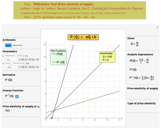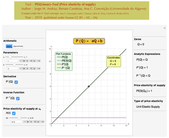 The PES(Linear)-Tool was created as an interactive Mathematica notebook and it is available online, in the Computable Document Format, as a supplement to this article. It allows the exploration of concepts related to a market supply function (3), where , and It should be noted that the particular case of was also included to exemplify the perfectly elastic supply (when ) (see Figure 7). In terms of implementation and in spite of their mathematic simplicity, constant functions should be dealt with separately because they have no inverse function (see Figure 7). This means that the constant case has to be coded separately, in order to generate the correct analytical information for those functions. The PES(Linear)-Tool provides all graphical and analytical information of the inverse function of (that is, the market supply function). As students often confuse the concepts of elasticity and derivative, the tool provides the option “Derivative” on the left panel (see Figures 10–12). The PES(Linear)-Tool displays graphical information on the value of the PES() whenever this option is selected. This allows the user to visualize the change from an economic model with an elastic supply to a model with an inelastic supply (going through a unitary elastic supply). As in the F-Tool, the user can interact with this information in real time.