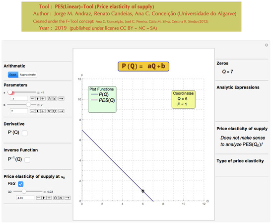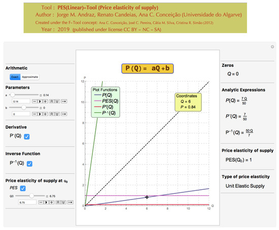 The above mentioned issues constitute several gaps which the new tool intends to fulfill. The PES(Linear)-Tool is a computer algebra tool directed to the study of one of the most widely used concepts in socio-economics courses—the price elasticity of supply. Starting with the specification of the market supply function, the design, functionalities and capabilities of the PES(Linear)-Tool are exhaustively explored in this paper to analyze the price elasticity of supply, accounting for all the mathematical possibilities for which the economic model makes sense. This tool also differs from other existing tools in that it can be downloaded at no cost and allows the complete analysis of multiple situations involving the study of the price elasticity supply in a dynamic and interactive way. Specifically, the tool offers the students the possibility of changing the parameters’ values in the economic model and getting both the analytical and graphical effects in real time. The new PES(Linear)-Tool has a very intuitive interface that allows even the most inexperienced user, with no previous knowledge in educational software, to start using all the features in an efficient and autonomous way.