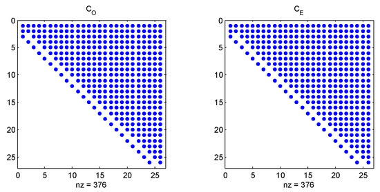 Since in Proposition 1 is an orthogonal basis, then is the tridiagonal matrix with the coefficients of its three term recurrence relation. Therefore, for problems with polynomial coefficients, matrices of Corollary 1 are banded matrices, with all non-zero elements between the diagonals.