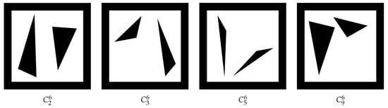 In this work we focus on a new kind of tags based on order type (OT) [,], called order type tags (OTTs), which are projective invariant and are also suitable for automatic identification and pose estimation []. These markers are composed of a typical black square frame with an inner white square and with black triangles inside of this last white square. Four examples of these OTTs are shown in Figure 1. The position of the triangle vertices form the set of points from which is possible to calculate its associated OT. This OT also forms a unique identifier for each OTT.