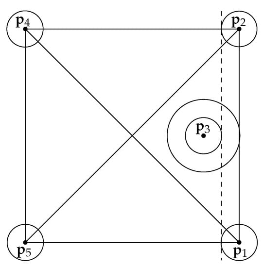 Given a set of points, its MP value is the maximal displacement that any and all the points can have safely without changing the original OT. Let C represent any set of points, the maximal perturbation is defined as the half of the minimal distance from any point to any line defined by a pair of points in C with . In Figure 2 the MP concept is illustrated with one example: five points are drawn in a plane, the radius of the bigger circle represents the minimal distance in any point to a line, and for this example is from point to line ; the radius of the smaller circle is the MP, any point can be inside its respective smaller circle and the respective OT is kept. If points and , or points and , simultaneously cross the dashed line, the OT changes: The figure will be an irregular pentagon instead of a square with one point inside.