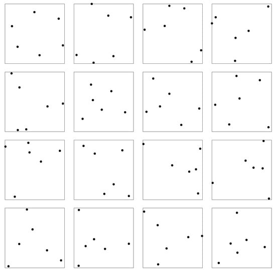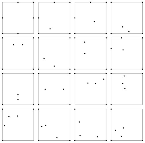 The sixteen instances (or subsets) of are shown in Figure 3. Each one is numbered row by row (the first one in the upper corner at the left) and the number of points in their convex hull is in Table 1. The instances 1, 2, 3, 8, 9, and 10, which have 6, 5, 5, 5, 4, and 4 points in the convex hull, respectively, are trivial to optimize because of their symmetry in the convex hull points. The easiest instance is 1 because it has all its points form its convex hull, the resulted instance can be seen in Figure 4.