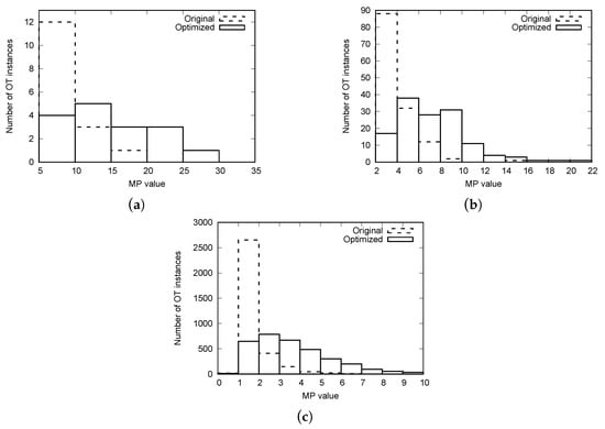 Histograms of the number of OT instances with respect to the MP values. The original MP values of the database in [] and the ones obtained with our proposed algorithm described in Section 4 are shown. (a) Histogram for ; (b) Histogram for ; (c) Histogram for .