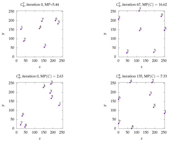 Two instances of the initial and resulting sets of points are shown in each row in Figure 8. In this figure, the left column shows the initial set of points and their associated MP value, the column at the right shows the obtained results in the last iteration of our approach, and their associated MP value.