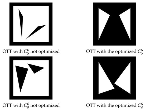 In Figure 9 we can compare the OTTs made with the and subsets before and after the optimization by hand, as explained in Section 3. These two markers without their optimized point positions were shown previously in Figure 1. The markers are detected first in the input image as the black object with four corners; then, for the markers without optimize (in the left column of Figure 9), the black triangles inside the white zone are extracted. For the optimized markers built with and , these set of points have a convex hull that is also a square, thus the white zone was eliminated and white triangles are used instead. The elimination of this white zone (see the markers in the second column of Figure 9) increases the area cover by the optimized and set of points. A bigger area makes these optimized markers easier to recognize at farther distances.