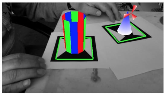 A picture of an augmented reality application that shows two virtual objects drawn above the optimized markers and . These markers are also shown at the right of Figure 9.