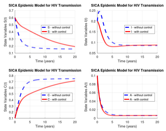 where the control is bounded between 0 and , with . When the control vanishes, no extra preventive measure for HIV transmission is being used by susceptible individuals. We assume that is never equal to 1, since it makes the model more realistic from a medical point of view.