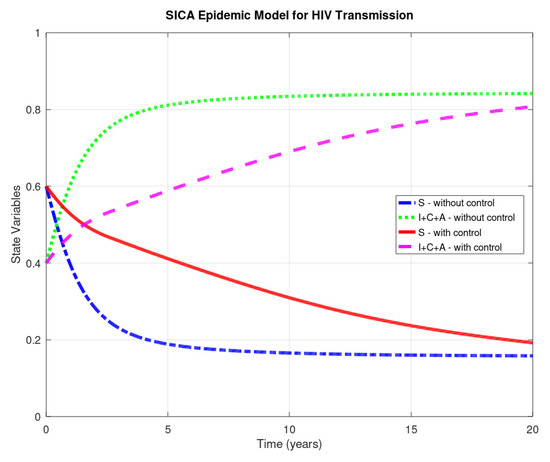 We consider the SICA epidemic model for HIV transmission proposed in References [10,11], which is given by the following system of ordinary differential equations:
