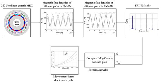 The performed approach is composed of two main modules, viz.: (i) a 2-D generic MEC, and (ii) a 2-D analytical model based on the Maxwell–Fourier method. The first one allows the calculation of magnetic flux density B without the skin effect over all the PMSM. In the PM zones, the magnetic flux density is levied on different paths parallel in the tangential direction. Indeed, the magnetic flux density varies depending on the PM depth direction. These magnetic flux densities will be subjected to the FFT giving the amplitude as well as the frequency of different harmonic numbers. Furthermore, these outputs constitute the main input parameters to estimate the PM eddy-current losses by using the developed formal Maxwell model. Note that only the harmonics are going to be taken into account when calculating the eddy-current losses. The eddy-current losses due to the average value are null because the resultant eddy-current density in the PMs does not exist. The developed approach for the eddy-current loss calculation is explained in the flowchart shown in Figure 1.