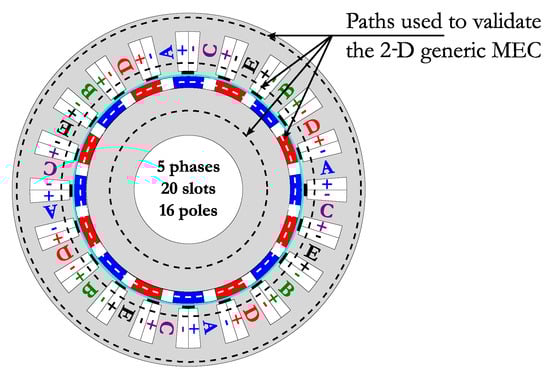 The performed model was applied to a five-phase surface-mounted PMSM, where the geometrical and physical parameters are given, respectively, in Table 1 and Table 2. Figure 2 gives the topology of the machine and the spatial distribution of various phases. The stator has a double-layer concentrated winding distribution (viz., the non-overlapping winding with all teeth wound), supplied by sinusoidal current waveform. The five-phases windings are star-connected. The PMs, radially magnetized, and the sheet metal are, respectively, NdFeB and M270-35A. The dashed lines represent the different paths used to proof this approach. Based on this path, the local quantities will be levied and furthermore compared to those of FEA [21].