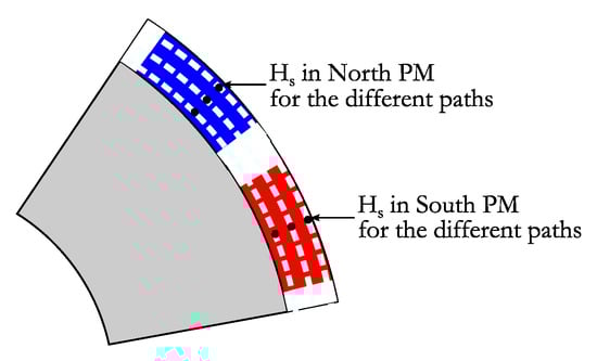 The magnetic field with the skin is determined from an analytical model in 2-D Cartesian coordinates (i.e., the PMs are assumed rectangular) based on the Maxwell–Fourier method (i.e., the formal resolution of Maxwell’s equations by using the separation of variables method and the Fourier’s series). This permits to estimate the resultant eddy-current density in PMs in both directions (i.e., axial and circumferential axis). The BCs imposed on the 2-D analytical model are equivalent to the magnetic field obtained from the MEC. These BCs are considered homogeneous on the edges of massive conductive parts, which are equal to . This is a strong hypothesis because the magnetic field is naturally non-uniform. The value of magnetic field is defined as the normal magnetic field in the top or middle of PMs determined by 2-D generic MEC i.e., without the skin effect, viz., . In our case, the model gives ability to use both conditions (i.e., in the top or middle of massive conductive parts), allowing to see the impact on the eddy-current loss calculation. Furthermore, the results will be given for different paths parallel to the tangential direction. The various BCs are shown in Figure 16.