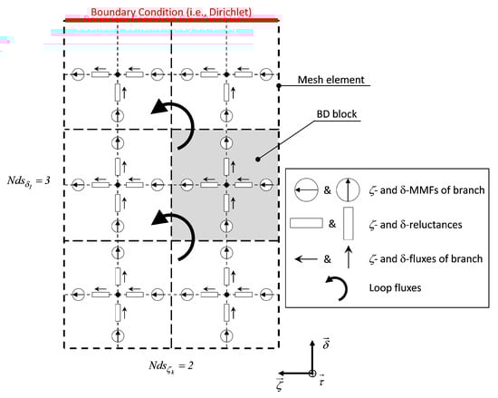 In this work, the approach proposed in [22] (viz., the generalized nonlinear adaptive MEC) was applied onto the 5-phases PMSM. Indeed, the 2-D MEC is based on the discretization principle, which allows bidirectional (BD) automatic mesh reluctance generation. In a general manner, the electrical machine can be discretized in a set of mesh elements that can be, in turn, discretized in a high number of BD blocks. As an example, the mesh element spotted by the grey color in Figure 4 can be discretized in a set of BD blocks, as shown in Figure 5.