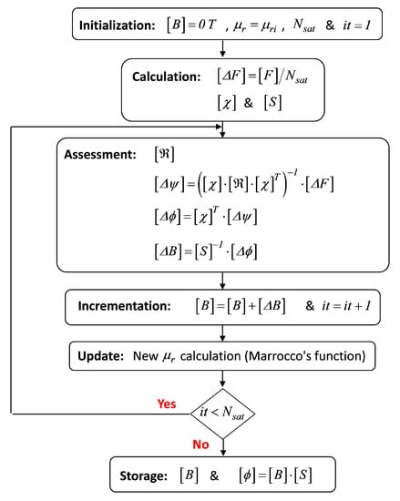 The developed model respects the flowchart given in Figure 6, where the different steps of the nonlinear system solving are presented. To account for the saturation effect, an iterative process is considered by using the fixed point iteration method. The nonlinear B(H) curve of the iron is then introduced by using the Marrocco’s interpolation function. In Figure 6, represents the initial relative permeability in the magnetic circuit and is the total iterations number for taking into account the saturation effect. The 2-D nonlinear adaptive MEC (where the loop fluxes are the unknowns) can be expressed by