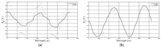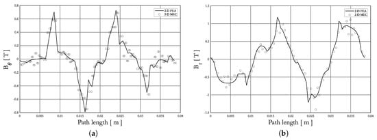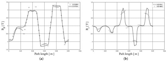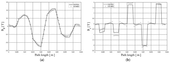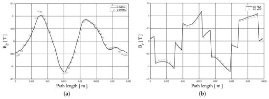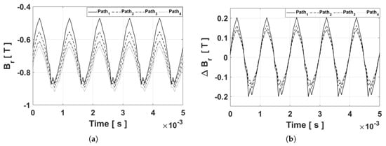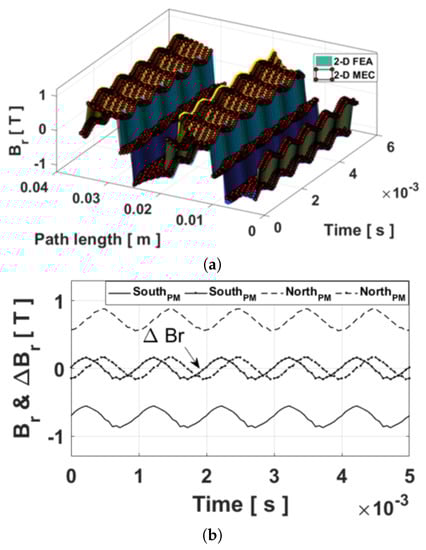 As mentioned in Section 2, the performed model will be used to extract the local physical quantities in PMs in order to estimate the eddy-current losses. Moreover, it should be noted that in the PMs is considered negligible in relation to (see Figure 11). The losses are then determined from the normal magnetic field in the PMs. The model can give the waveform of B according to the time or the rotor position. The simulations are done for the path crossing the middle of PMs for one periodic pattern as shown in Figure 15a. The results are in agreement with the 2-D nonlinear FEA. Figure 15b gives the magnetic flux density evolution in the middle of North and South PMs.