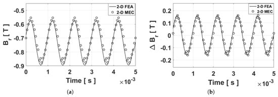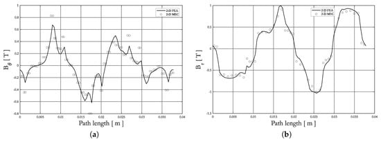 The tangential and radial components of B at are given in Figure 7, Figure 8, Figure 9, Figure 10, Figure 11 and Figure 12 for the different path crossing, viz.: the stator yoke, stator teeth, stator air-gap, rotor air-gap, rotor PMs and rotor yoke. The components of B in the stator teeth [see Figure 8] are very saturated. The results are in agreement with 2-D nonlinear FEA, which confirms that the nonlinear solving method is accurate. The errors are due to the discretization of static and moving zones in both tangential and radial directions. For example, a sensibility study versus stator/rotor discretization on the computation time as well as on the iron losses determined from the magnetic flux density in the stator/rotor iron have been performed in [27]. The difference is mainly linked to the discretization for the rotor yoke where , which can be observed on the Figure 12a of the tangential component of B in the rotor yoke. The computation time is reduced by twice compared to the 2-D nonlinear FEA.
