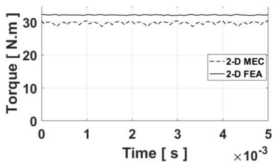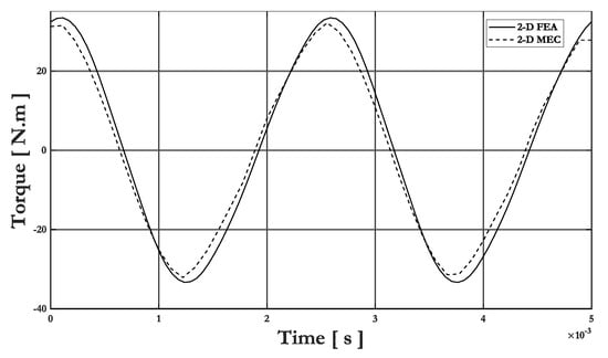 The simulation in time stepping leads to the results represented in Figure 13, Figure 14 and Figure 15. The electromagnetic torque evolution at locked rotor is given in Figure 13; this help us to find the shift angle to obtain the maximal electromagnetic torque at synchronism shown in Figure 14. The results give a decent satisfaction. The average electromagnetic torque given by 2-D nonlinear FEA is equal to while the 2-D nonlinear adaptive MEC is slightly above . The error is equal to . This small difference can be linked to the approach used to take into account the magnetic saturation, the rotor motion as well as the air-gap, stator and rotor discretization.