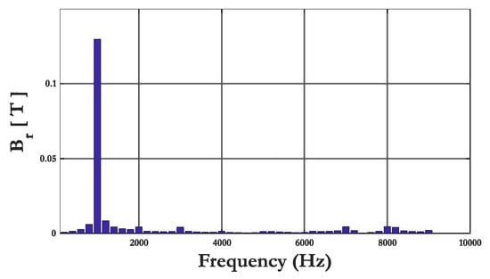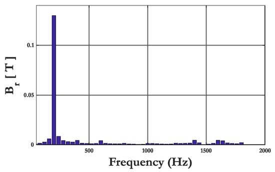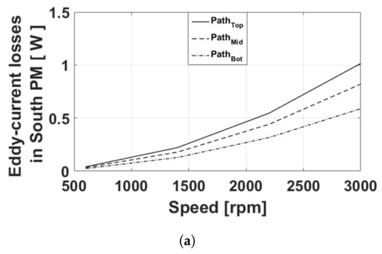 Figure 19 and Figure 20 show the frequency spectrum of the radial component of B for different speeds. The spectral components are due to: (i) the supply (i.e., the current waveform), (ii) the slotting effect, and (iii) the spatial distribution of winding. Using the results given by the FFT for different paths in the PM, the PMs eddy-current losses can be estimated for each path as shown in Figure 21a,b.