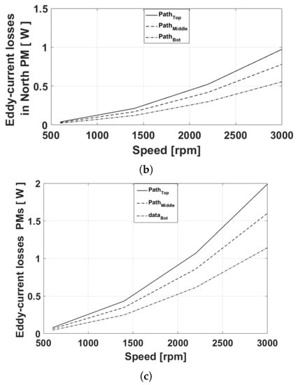 Non-uniform volume repartition of the eddy current losses vs. speed for different paths: (a) South PMs, (b) North PMs, and (c) Total.