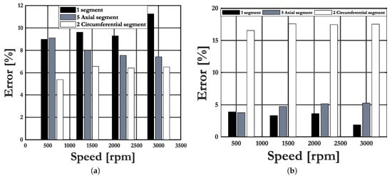 Figure 23 represents the relative error between each approach and 3-D nonlinear FEA. These errors are due to medium mesh in the 3-D nonlinear FEA as well as the magnetic field evaluation on all paths of the 2-D nonlinear adaptive MEC which is a data input the analytical model based on the Maxwell–Fourier method permitting the PM eddy-current loss calculation. In both cases, the results provide a good agreement with a maximal error of that is reached for the 2nd approach based on the middle path with two circumferential segments. While the maximal relative error for the 1st approach is estimated at , which is achieved for one segment (no-segmentation) at 3000 rpm.