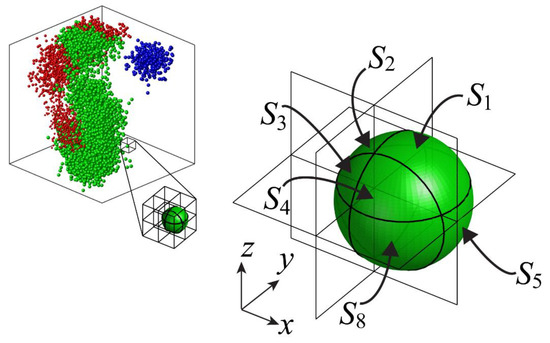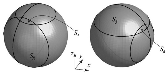 There are several different algorithms that generate uniformly distributed sample points on spheres [15,16,17,18,19]. We used normally distributed random vectors to generate uniformly distributed sample points on spheres [20,21]. When three-dimensional vectors, , are generated with all values from , the standard normal distribution, the collection of are uniformly distributed on the unit 2-sphere as vertices (points). Here, . A set of these random points will be generated. For any sphere representing a cell, these random points will be scaled and translated to fit on the surface of a cell-representing sphere. Five areas, in Figure 1, for example, will be approximately calculated using a Monte Carlo method, that is, by counting points on the corresponding regions. The remaining three values will be calculated by Equation (7).