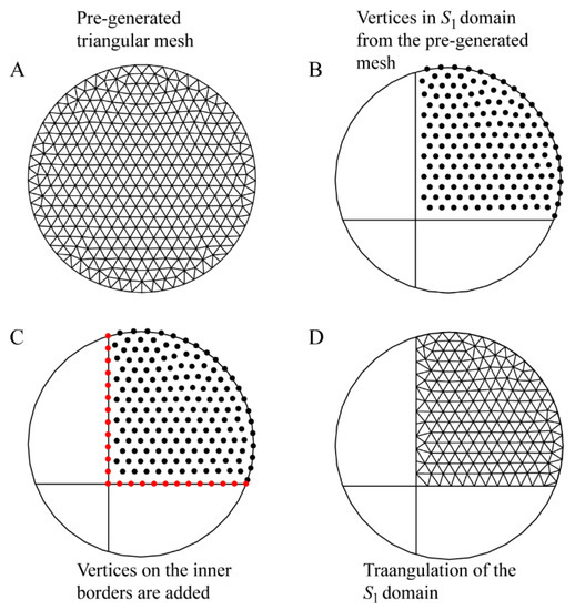 The triangulation for the domain of . Panel (A) shows the pre-generated triangulation of a disk with a desired resolution. In panel (B), vertices in the domain for are identified and collected. In this process, those vertices that are too close to the inner border lines are excluded. Panel (C) shows newly added vertices on the inner border lines (red dots) with a similar spatial resolution. The triangulation based on the black and red vertices is done in panel (D). The value of is calculated using this triangulation.