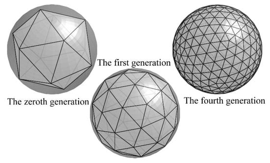 - Baumgardner, J.R.; Frederickson, P.O. Icosahedral Discretization of the Two-Sphere. SIAM J. Numer. Anal. 1985, 22, 1107–1115. [Google Scholar] [CrossRef]