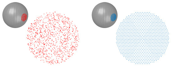 As the generation number increases, the number of total vertices increases. If , , and denote the number of vertices, edges, and faces, respectively, of the th-generation, we have , , . It is also obvious that and . Since the Euler characteristic of a genus zero surface is 2, . Thus, we can only choose the number of vertices from the sequence of . We will pick a vertex set from a generation and use them as random sample points for the Monte Carlo method. Figure 5 compares vertices on a matching region from the random 40,962 sample points from the uniform distribution in Section 0 and vertices from the sixth-generation icosahedral vertices. The vertices collected from random sample points show stochasticity, whereas the points from the icosahedron-based vertices are spaced regularly.