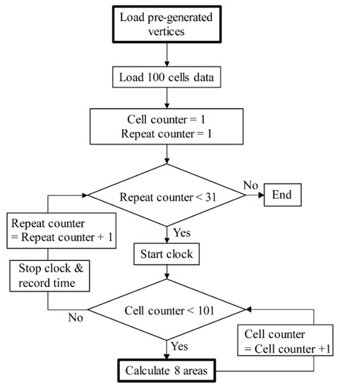 Flow chart for computations in three methods. This flow chart describes the basic structure of the computations performed by three methods. There are two parts that are method specific. They are indicated with thickened boxes. A set of pre-generated 100 cells is commonly used. Each method computed eight areas of every cell—a total of 800 area calculations. These calculations are repeated 30 times to measure the average computation time.