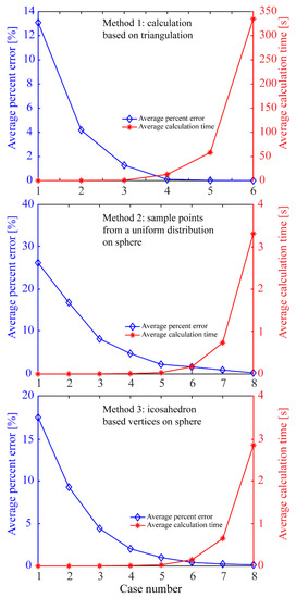 Figure 7 shows the average percentage error and the average computation time of all three methods with up to eight cases as listed in Table 1. The blue lines in each graph show the average percentage error and the red graphs are the average calculation time. All methods show increasing computational time as the error decreases. The patterns of increment and decrement are approximately exponential. The exponential increment and decrement are expected since the number of vertices in the icosahedron-based vertex generation approximately goes up by four-fold from one generation to the next generation, while other methods followed the number of vertices in the icosahedron-based method. The triangulation method always showed better accuracy for equivalent vertices counts. The worst error is about 13% whereas the other methods recorded higher than 17% error. The lowest average error for the triangulation method was 0.015% but the other two methods could not achieve that low-level error even with a larger number of vertices. While the triangulation method achieved the best accuracy, it took much longer to produce more accurate results. Monte Carlo methods finished calculations in about 3 s in case number 8, whereas the triangulation method took approximately 350 s in case number 6. In the algorithm of the triangulation method, the triangulation of the domain depicted by D in Figure 3 is done by the Delaunay algorithm. This turned out to be computationally expensive. Comparing two Monte Carlo methods, the icosahedron-based method was superior to the sampling from a uniform distribution. Since the vertices themselves in the icosahedron-based method are almost uniform, the icosahedron-based method achieved better average accuracy than the Monte Carlo method using sample points from a uniform distribution. The stochasticity in the sample points presumably contributed to the bigger average error even though two methods use the same number of vertices. Interestingly, the computation time was also slightly but consistently longer in the case of the sample points method.