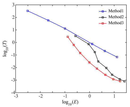 The average computation time () vs. the average percent error () in the common logarithm scale. The method 1 is the calculation based on triangulation. The method 2 is the Monte Carlo method using sample points from a uniform distribution on a sphere. The method 3 is the Monte Carlo method using the icosahedron-based vertices. The data points are from Figure 7.