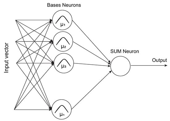 Evolutionary computing and artificial neural networks are main classes in computational intelligence [,]. Most of the research focus on how to use EAs to get more trained ANN [,]. There is relatively little research studying how to do the opposite by using ANN to design better EA-based methods or even to construct global optimization methods such in [,]. In this research, the Radial Basis Functions (RBFs) are invoked as an efficient local ANN technique to help the EAs to reach promising regions and directions. Generally, other types of ANN could be used for the same task, such as the well-known multi-layer perceptron (MLB) with a training algorithm such as the back-propagation algorithm. However, RBFs is a local learning ANNs that could overcome the problem of long iterations learning process of other types of ANNs. In RBFs, the number of iterations is bounded maximum to the number of input samples. In other words, the middle layer adds one neuron per any new input sample, as shown in Figure 1.