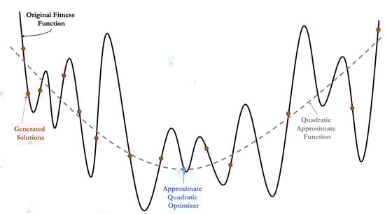 The least-square quadratic regression (also known as a nonlinear or second-order regression) is used because it is a fast and simple method for fitting. Moreover, it produces a good approximation and has very encouraging properties that can solve high-dimensional functions by finding A, b, and c in Equation (2). Thus, the idea is to choose a quadratic function that minimizes the sum of the squares of the vertical distances between the original fitness function values at generated solutions and an approximate quadratic function with finding coefficients A, b and c, as shown in Figure 2. Then, approximate quadratic optimizers of the quadratic models can be given by Equation (3), which is represented by the derivative of Equation (2).