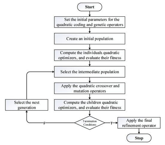 The algorithmic scenario of QCGA is shown in Figure 3. In each iteration of the QCGA algorithm, an intermediate parent population is generated using the linear ranking selection mechanism []. Then, the arithmetical crossover and uniform mutation operators [] are applied to reproduce the offspring. After getting the children, the survival selection is applied to select the survival members based on the members’ elitism. Finally, the QCGA uses local search methods of Nelder–Mead [] and the heuristic descent method [] as a final intensification step to refine the best solutions found so far.