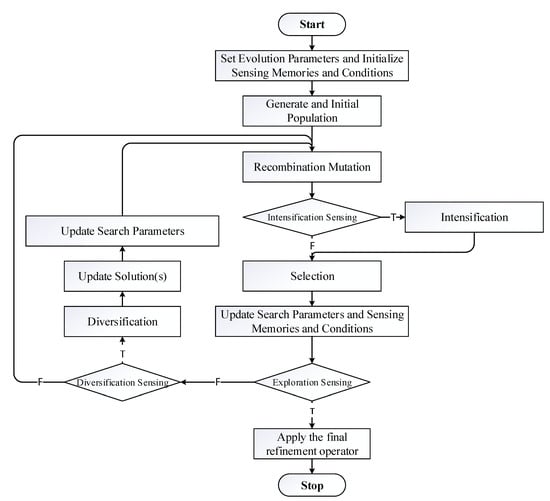 The main structure of the proposed Sensing Evolution Strategies (SES) is shown in Figure 4. In the following, full details of the SES method and its algorithm steps are described. The SES method starts with a population of real-coded chromosomes. The mutated offspring is generated as in the typical ESs [,]. Therefore, a mutated offspring is obtained from a parent , where the i-th component of the mutated offspring is given as: