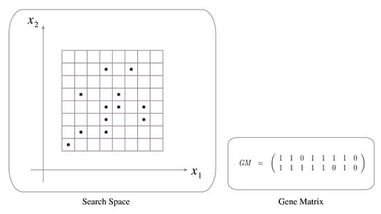 In designing the proposed methods, EAs are customized with different guiding strategies. First, an exploration and exploitation strategy is proposed to provide the search process with accelerated automatic termination criteria. Specifically, matrices called Gene Matrix (GM) are constructed to sample the search space [,,]. The role of the GM is to aid the exploration process. Typically, GM can equip the search with novel diverse solutions by applying a unique type of mutation that is called “mutagenesis” [,]. Principally, mutagenesis may be defined as a nature mechanism by which the genes of an individual are changed, which lead to the mutation process. Thus, this mechanism is a driving force of evolution process []. Thus, the mutagenesis operator alters some survival individuals to accelerate the exploration and exploitation processes []. On the other hand, GM is used to lead the search process to know how far the exploration process has gone to judge a termination point. Moreover, the mutagenesis operation lets the proposed method, the GA with Gene Matrix, perform like a so-called “Memetic Algorithm” [,] to accomplish a faster convergence [].