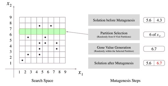 The mutagenesis operation starts with selecting a zero-position in the GM, which is corresponding to a zero-visit partition. Selecting such GM-entry is done randomly. Then, a new value of the gene related to the selected GM-entry is generated within the corresponding partition of the selection, as illustrated in Figure 6. The formal description of this mechanism is stated in Procedure 4.