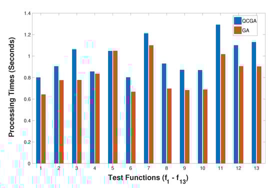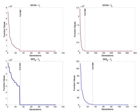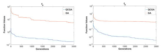In the following, the experimental results are discussed. All the proposed methods are programmed using MATLAB. The parameters values used in QCGA and SES algorithms are set based on the typical setting in the literature or determined through our preliminary numerical experiments, as shown in Table 1 and Table 2. Two classes of benchmark test functions have been invoked in the experimental results to discuss the efficiency of the proposed methods. The first class of benchmark functions contains 13 classical test functions – []. Those functions definitions are given in Appendix A. The other class of benchmark functions contains 25 hard test functions – [,] which are described in Appendix B.