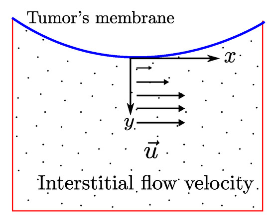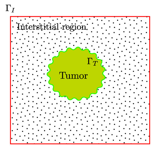 To apply the boundary conditions we decompose the boundary of the region in two non-overlaping regions, as shown in Figure 3, , the boundary of the tumor region and the boundary of the interstitial region considered, respectively. We consider homogeneous Dirichlet boundary condition for the velocity over the cells membrane and non-homogeneous on the interstitial region boundaries, i.e., and parameters and k given by Table 1, for the cases under study.