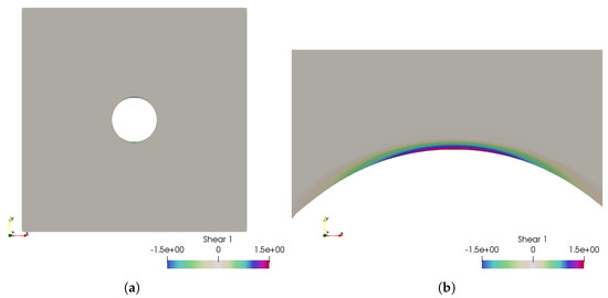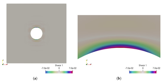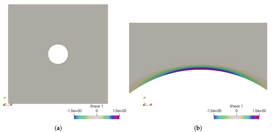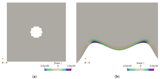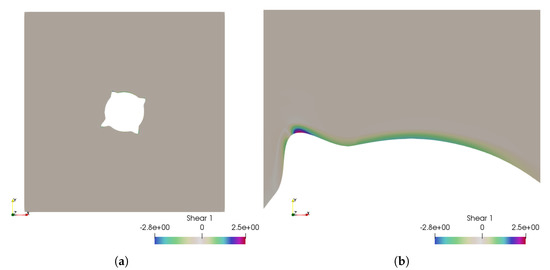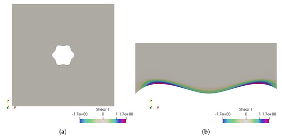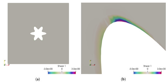 Case 1: the fluid shear stress representation, which is between and . (a) The fluid shear stress overview; (b) zoom over the higher shear stress zone.