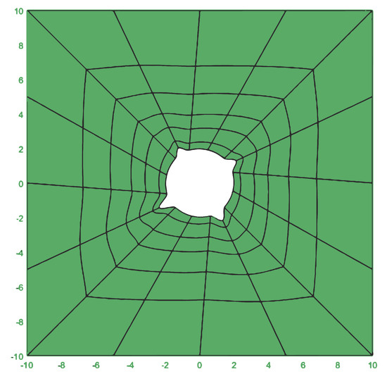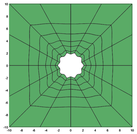 Case 2 is similarly to case 1, we consider and a centred tumor region with a circular irregular boundary, as shown at Figure 14. Whereas the irregular circular line is obtained from perturbations on the line of the pattern case 1, we quantify the boundary irregularities by comparison between the cells’ perimeter, introducing the parameter (the irregularity parameter indexed with the case study number) defined as