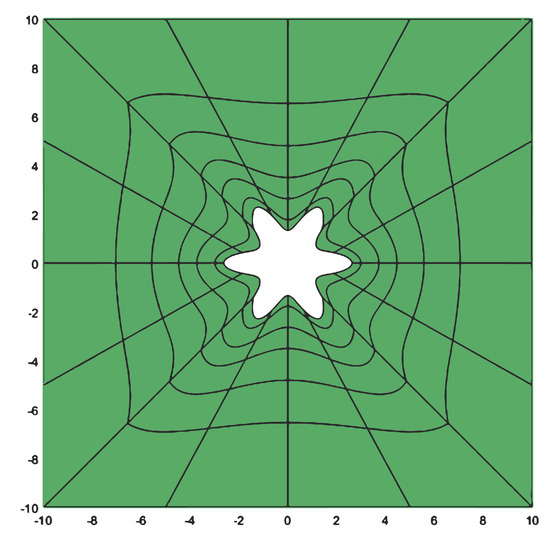 As in case 2, we consider and a centred tumor region with a circular irregular boundary. Here we increase the irregularity parameter to , as shown in Figure 17.