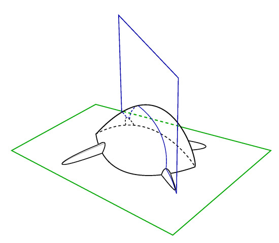 To conclude we present two more cases quite near to reality. Inspired by Figure 1 we define the outline shown in Figure 24. The following cases are determined from the outline 3D by cut planes for case 5, the green one, and case 6, the blue one.