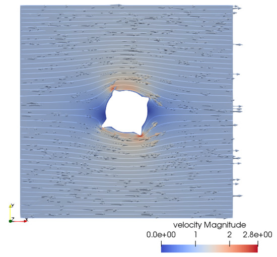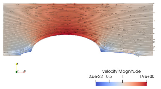 With this discretization the flow-generate shear stress is between and over the whole domain, as shown in Figure 10, and velocity magnitude is between and , Figure 11.