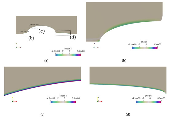 Case 6: the fluid shear stress representation, which is between and . (a) The fluid shear stress overview; (b) zoom over the higher shear stress zone; (c) zoom over the higher shear stress zone; (d) zoom over the higher shear stress zone.